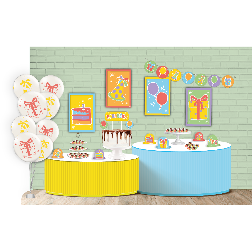 Com um design clean e adaptável a diversas temáticas, esse kit facilita a montagem do ambiente, garantindo um cenário harmonioso e especial para a mesa principal e todo o espaço da festa.